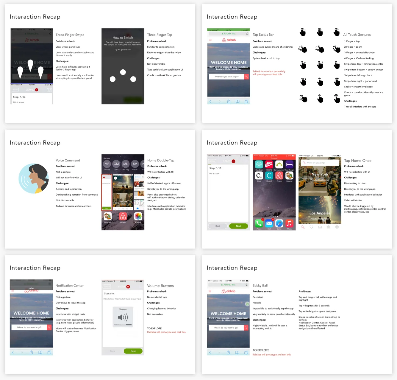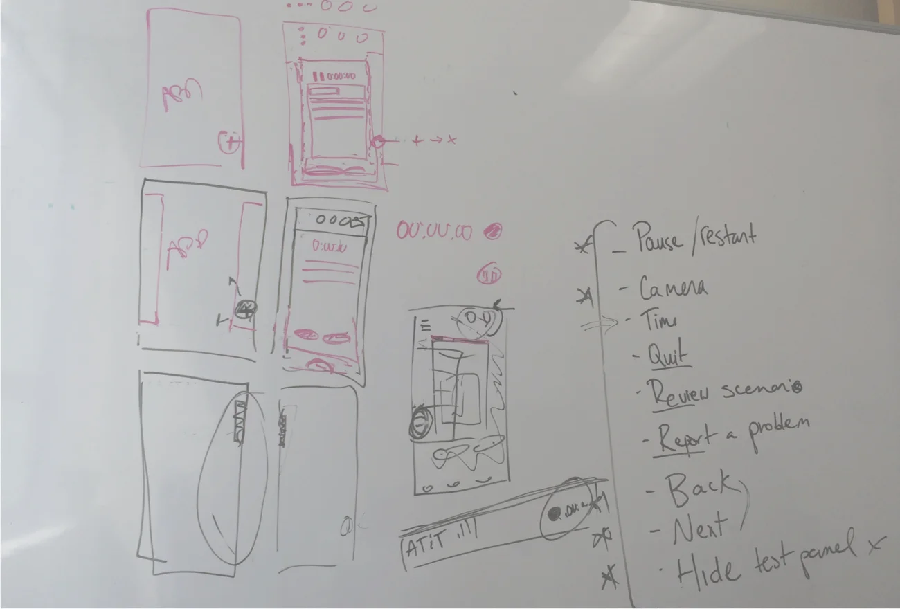 We landed on the “sticky ball”, similar to Apple’s accessibility ball. To define the sticky ball parameters, we made a list of everything that needs to happen and edge cases. The ball sticks to the sides of the screen, can be moved with a press and hold gesture, and dims when not being used so as not to distract the tester.