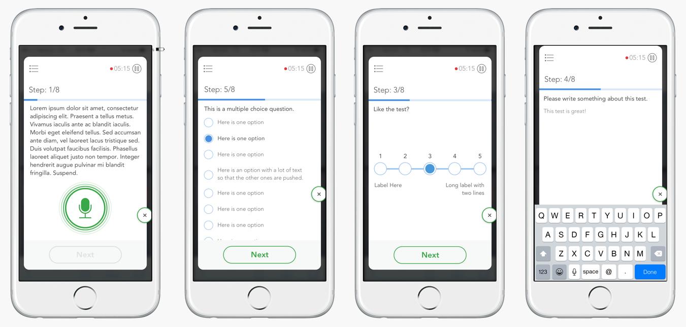 We utilized a card element for the test panel and created different UI controls for the various question types including: verbal response, multiple choice, rating scale, and written response. The card clearly displays the time, progress and how to move forwards in the flow. The "Next" button is not active until after the user has responded to a question so that they complete the test in the intended order.