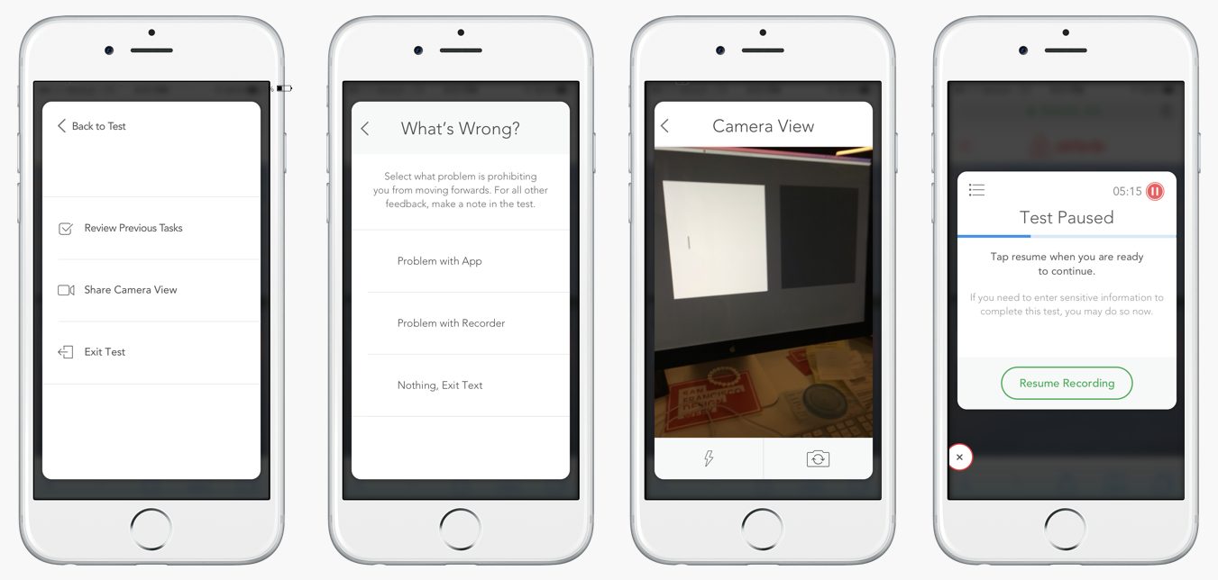 We nested secondary experiences in the menu icon. Only if absolutely necessary do we want the user to see past tasks, exit, or report a problem. Because we do not want the user to accidentally pause the test unless instructed, we made the paused state very overt and informative.